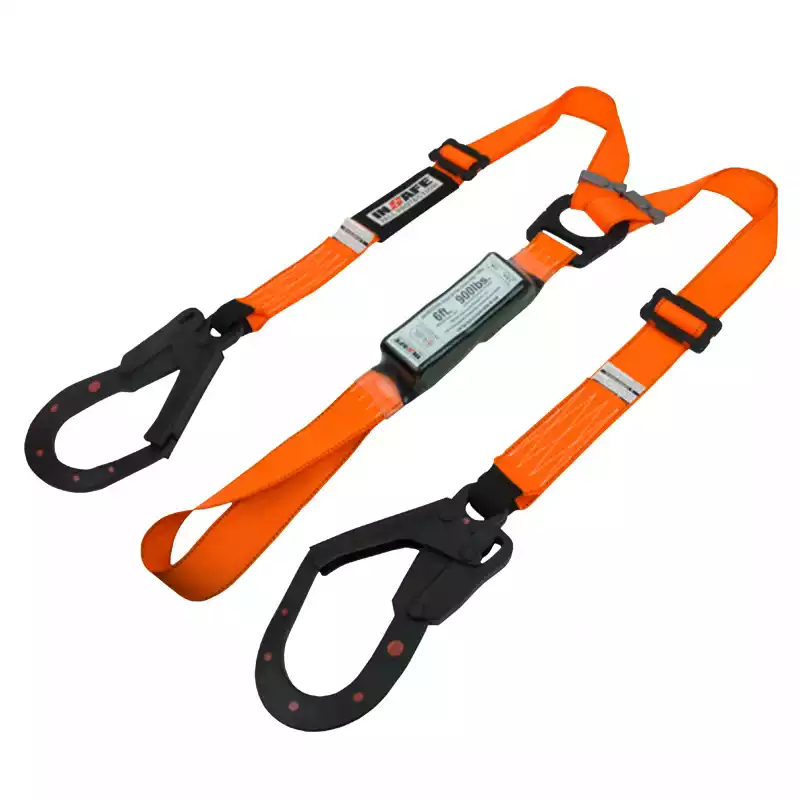 Elemento parte de un sistema personal de detención de caídas, eslinga en reata con doble terminal (tipo Y) regulable con absorbedor de argolla en reata, ganchos Dieléctricos de seguridad 2 ¼ con resistencia de 5000 lbf, sistema graduable a través de hebillas para aumentar o reducir la longitud de la eslinga. Paquete absorbedor de energía tiene una elongación máxima de 1.2m (48 pulgadas), en caso de una caída reduce la fuerza de impacto a 900 lbf (4kN) o menos.